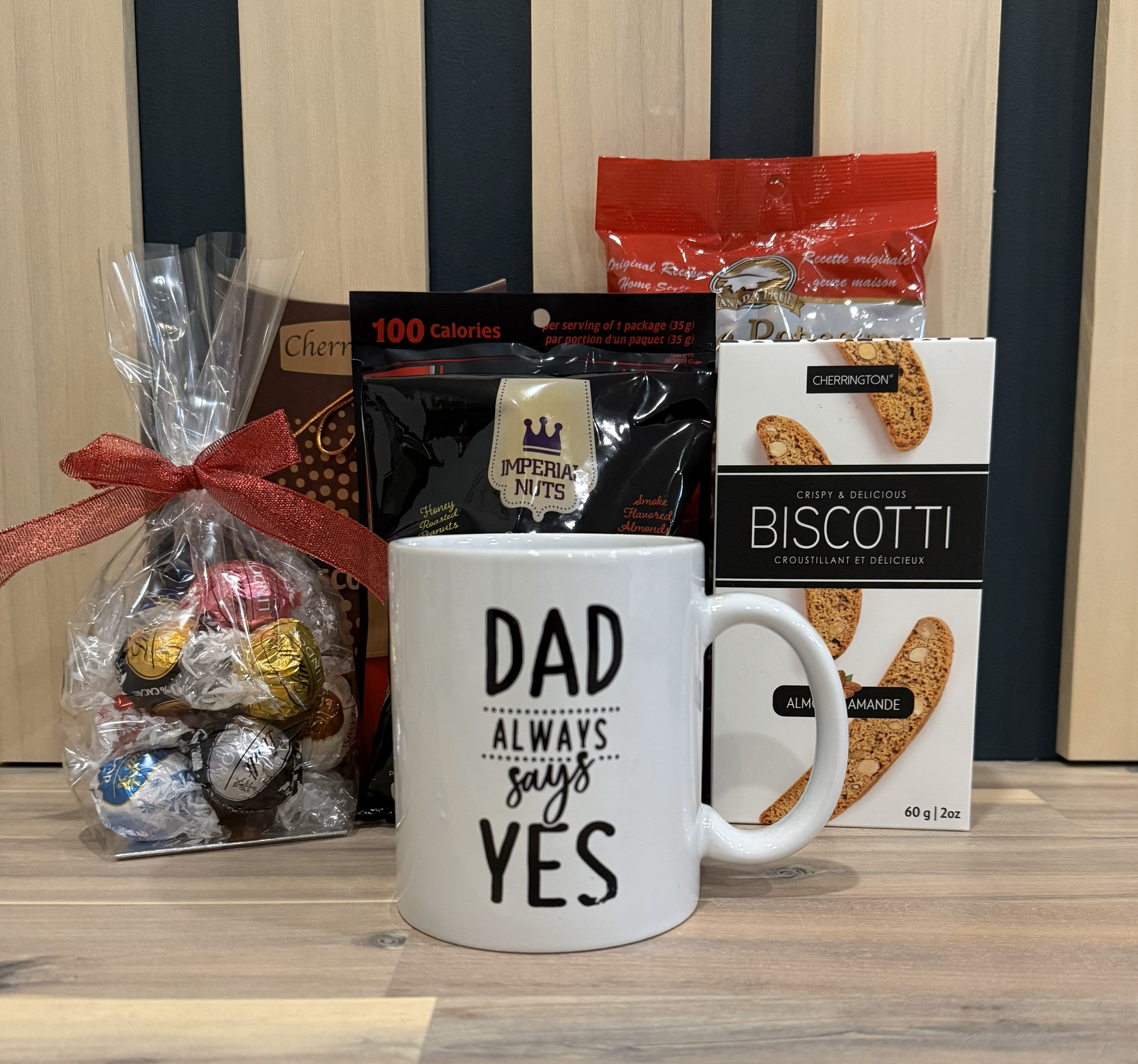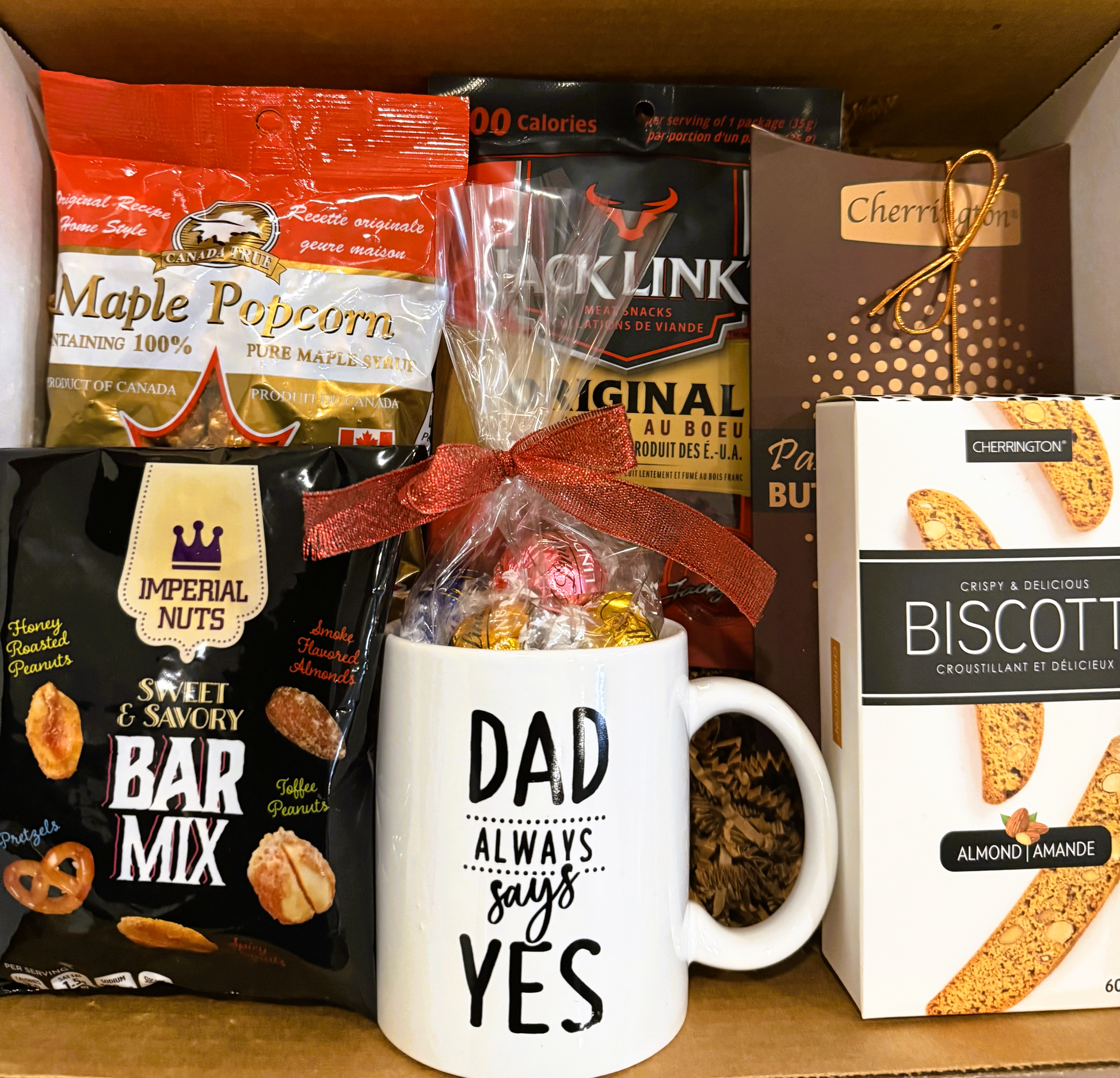 A special printed (Dad always says Yes) mug, delectable chocolates, almonds, nuts, candies, jerky and more.